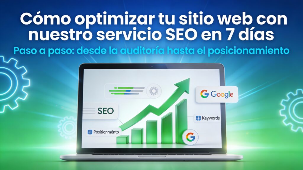 Descubre cómo optimizar tu sitio web en solo 7 días con nuestro servicio SEO especializado. Mejora tu posicionamiento, atrae más visitas y aumenta tus ventas de forma rápida y efectiva. ¡Impulsa tu éxito digital hoy!