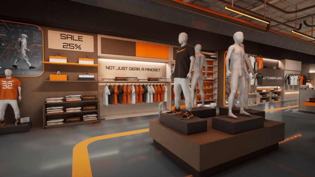Una vez dentro, los renders integran personas animadas que caminan y se ven interactuando en las diferentes partes del evento para maximizar el realismo.